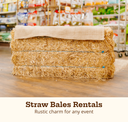 We rent 3-twine straw bales for $10 each. Pick up in-store or request delivery. Bales are charged at full retail price upfront; we refund the difference once they’re returned in good condition. Burlap bags are also available to rent for $4 each.